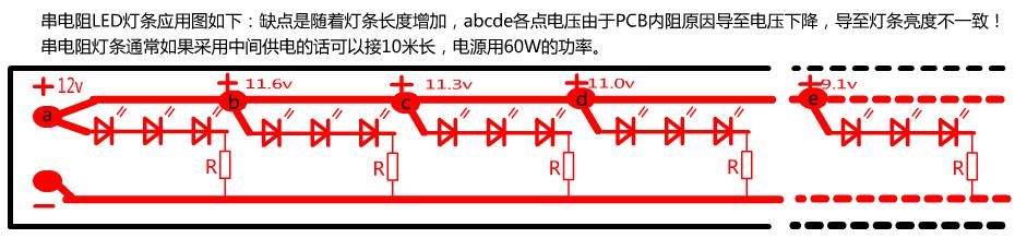 傳統(tǒng)的串電阻式的LED燈條接線方式如下: