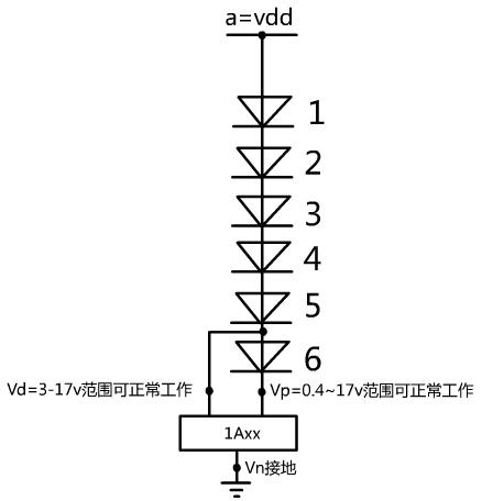 3, IC有三個(gè)腳,Vd, Vp, Vn。Vd正常工作電壓在3-17v, Vp正常工作電壓在0.4~17v, 假定燈珠1,2,3,4,5,6 的Vf都為3v,故30米后a點(diǎn)電壓變成18.5v時(shí)Vp點(diǎn)電壓為0.5v, Vd點(diǎn)電壓變成3.5v,這樣,Vd與Vp都處在正常工作電壓內(nèi),處于正常恒流狀態(tài)。得出結(jié)論:華芯串IC式燈條單端供電可達(dá)30米,雙端供電就是60米了,而且亮度一至。